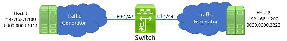 First, let’s get familiar with our topology. We have a Cisco Nexus switch connected to two traffic generators via physical interfaces Ethernet1/45 and Ethernet1/46. One traffic generator mimics a host named Host-1 with an IP address of 192.168.1.100, while the other traffic generator mimics a host named Host-2 with an IP address of 192.168.1.200.
