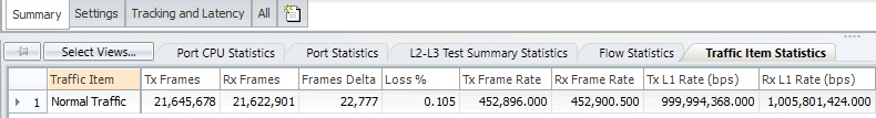 First, let’s analyze this topology in the “working state”, when the traffic from the Ixia’s Card 3 Port 14 emulating the security scanner is not running. In this steady state, no loss is observed for the production traffic running between the other two ports of the Ixia traffic generator. The 22 frames that Ixia reports are “missing” are the frames in-flight between a transmitting port and a receiving port - this is not indicative of packet loss, as the value is not steadily incrementing.