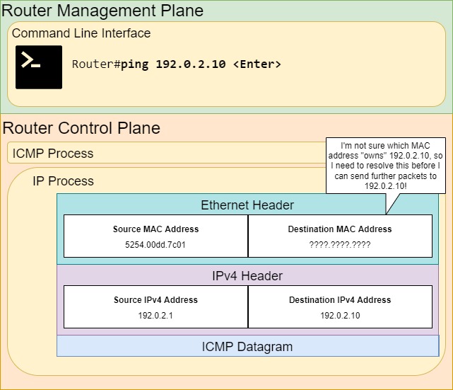 In this article, we will illustrate how and why this behavior happens by focusing on a simple topology where a router is attempting to ping a directly connected host.