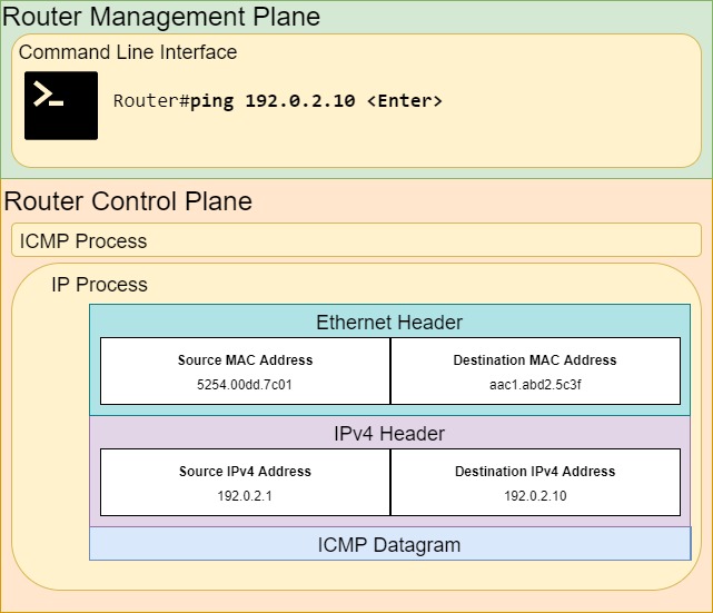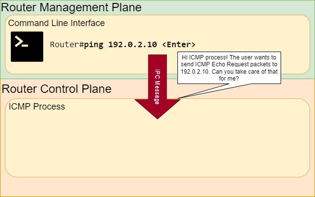 Let’s walk through precisely what happens when the ping 192.0.2.10 command is executed. First, the management plane sends a message through InterProcess Communication (IPC) to a software process of the network operating system responsible for handling the Internet Control Message Protocol (ICMP) for the device. We will refer to this software process as the “ICMP Process”. This IPC message informs the ICMP-related sofware process that the user would like to send ICMP Echo Request packets to a specific IPv4 address.