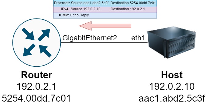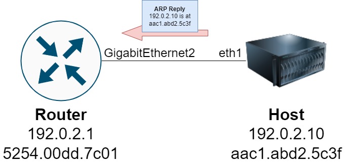The host will respond with a unicast ARP Reply frame informing the router that the host’s MAC address is aac1.abd2.5c3f.