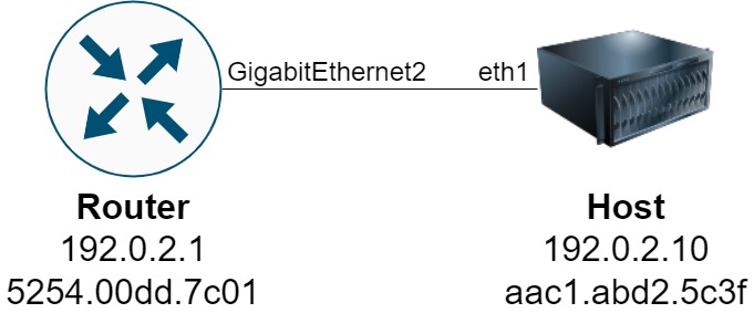 This topology involves two devices - a Catalyst 8000v virtual router named “Router” running IOS-XE 17.08.01a, and a Linux host named “Host” running the Ubuntu 20.04 operating system. Router’s GigabitEthernet2 interface with an IP address of 192.0.2.1/24 is directly connected to Host’s eth1 interface with an IP address of 192.0.2.10/24.