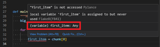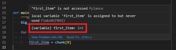 The real power from our use of generics comes when we interact with the chunk variable. If we hover over it, we see that it’s of type List[int] now, not a type of List[Any].