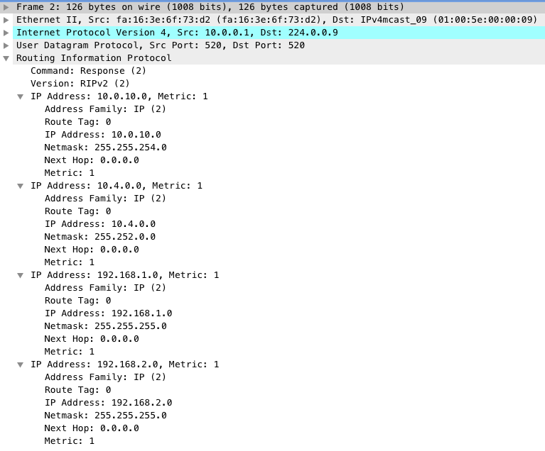 *Dec 27 13:39:10.666: RIP: sending v2 update to 224.0.0.9 via GigabitEthernet0/1 (10.0.0.1)