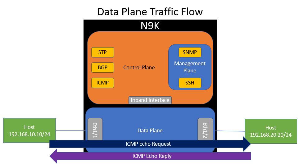 When the control plane receives this ICMP Echo Request packet through the inband interface, it will inspect it and “route” it to the ICMP software process so that the ICMP process can handle it accordingly.